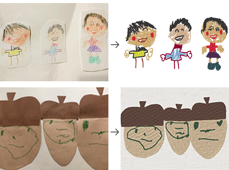 お送りいただいた絵や文字は、刺繍用に加工させていただきます。モチーフが小さすぎる・線が薄すぎる・数が多すぎるなどの場合、正確な再現や範囲内の刺繍が難しいため、できるだけシンプルなモチーフがおすすめです。